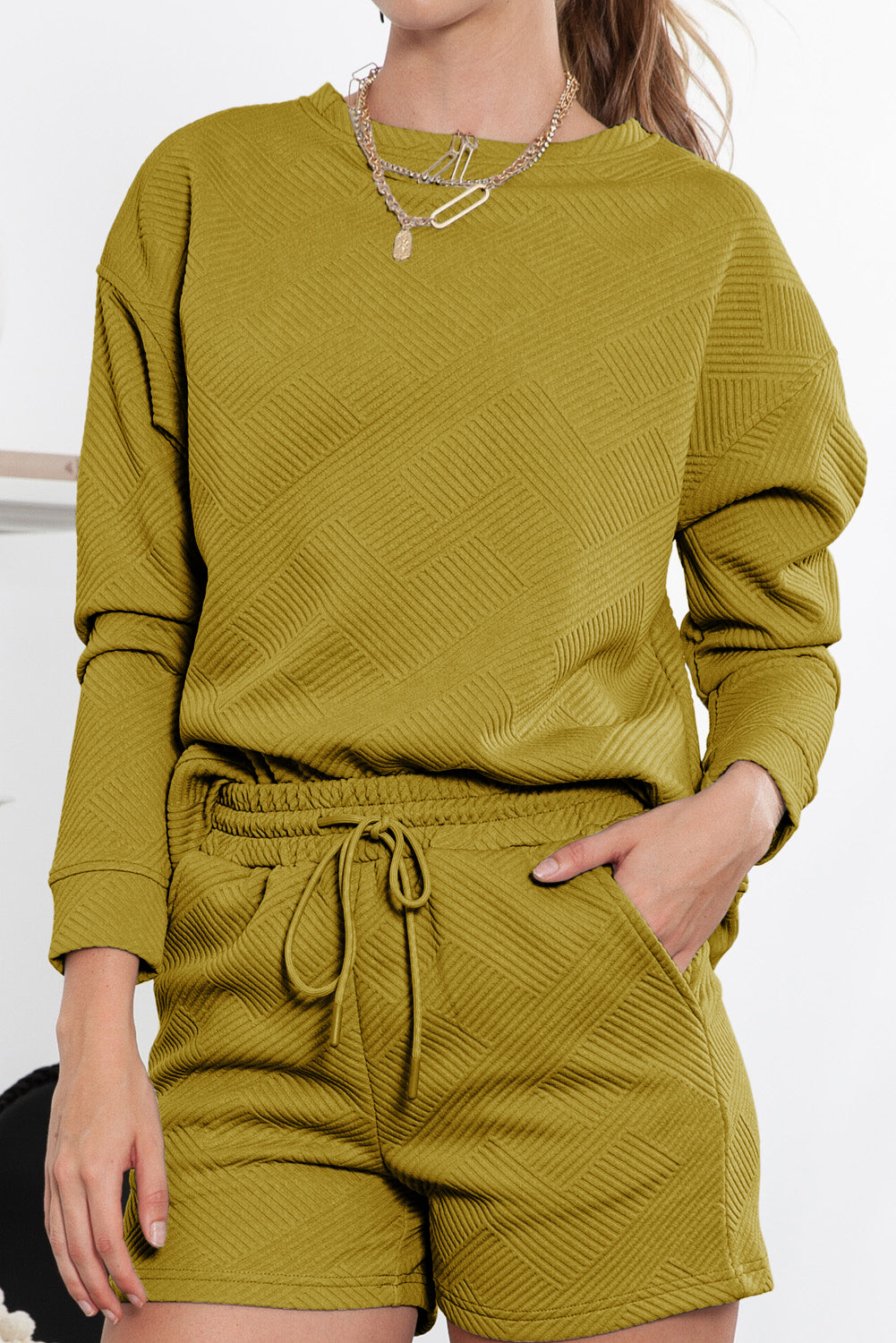 - Das Set besteht aus einem langärmligen Oberteil und passenden Shorts, beide aus strukturiertem Stoff in einem schicken Grauton.