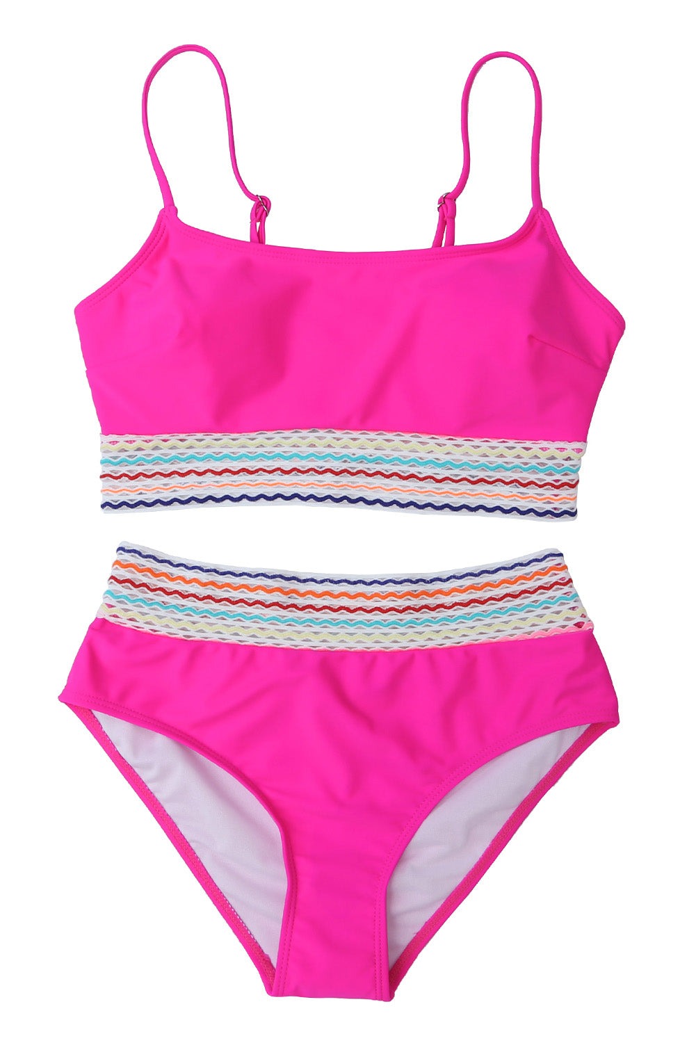 Bikini-Set mit Spaghettiträgern und hoher Taille und Patchwork-Muster in Rosa